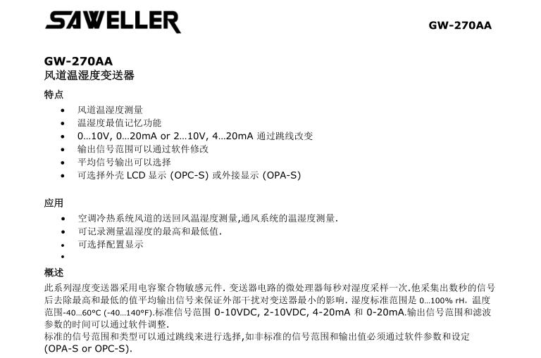 • 風(fēng)管溫濕度傳感器GW-270AA